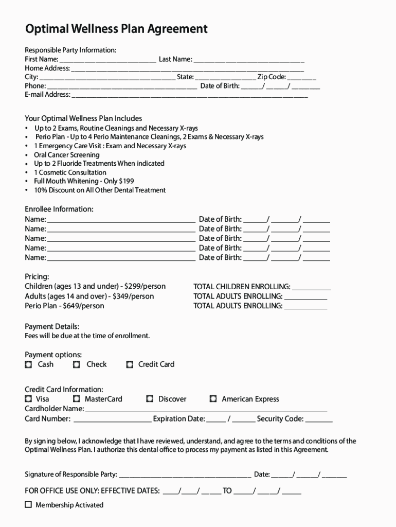 Optimal Wellness Plan Agreement Responsible Party Information: First Name: ___ Last Name: ___ Home Address: ___ City: ___ State: ___ Zip Code: ___ Phone: ___ Date of Birth: ___/ ___/ ___ Email Address: