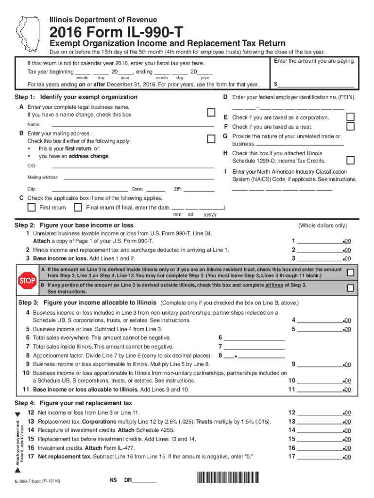 Obtain a copy of the 2016 form il-990-t from the Illinois Department of Revenue website or office.