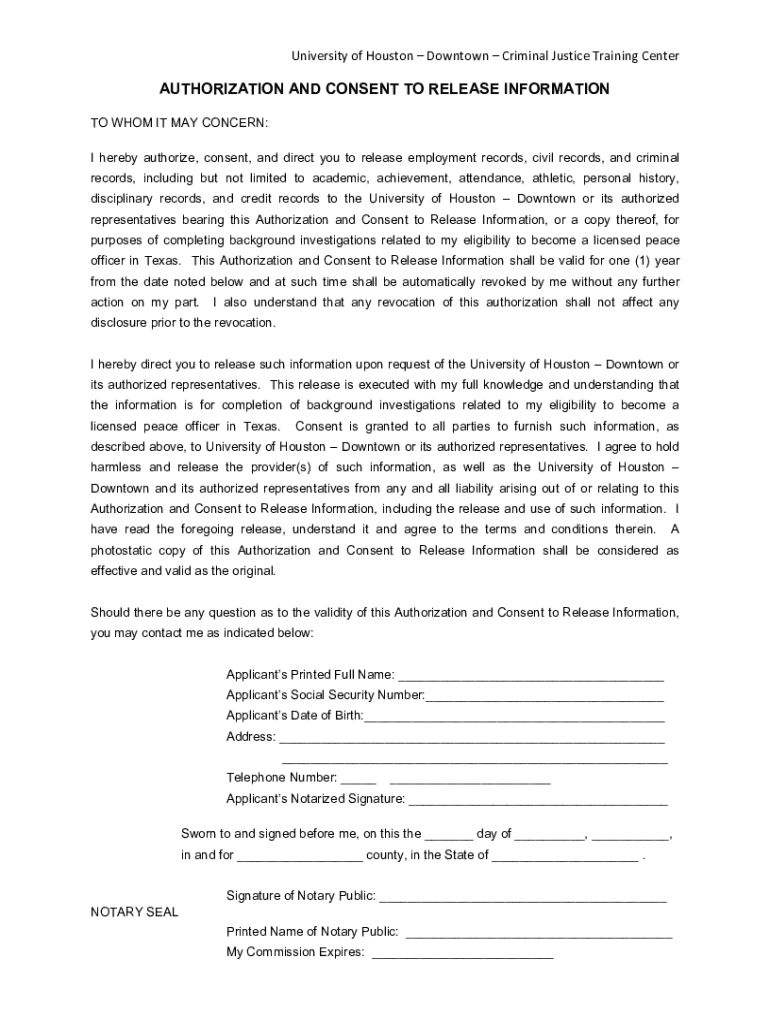 University of Houston Downtown Criminal Justice Training CenterAUTHORIZATION AND CONSENT TO RELEASE INFORMATION TO WHOM IT MAY CONCERN: I hereby authorize, consent, and direct you to release employment