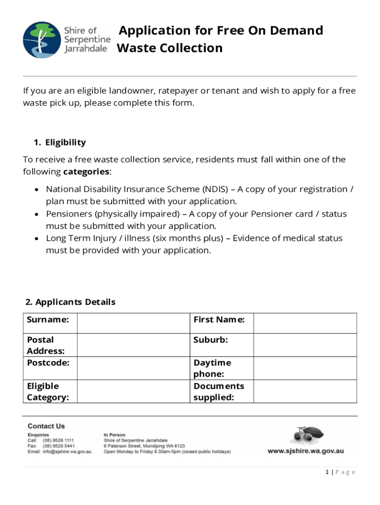 Application for Free On Demand Waste Collection If you are an eligible landowner, ratepayer or tenant and wish to apply for a free waste pick up, please complete this form.1. Eligibility To receive