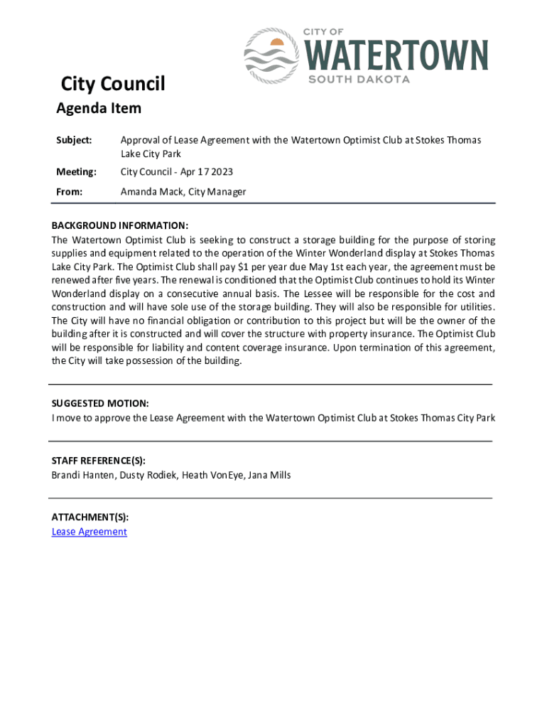 City Council Agenda Item Subject:Approval of Lease Agreement with the Watertown Optimist Club at Stokes Thomas Lake City Marketing:City Council Apr 17 2023From:Amanda Mack, City ManagerBACKGROUND