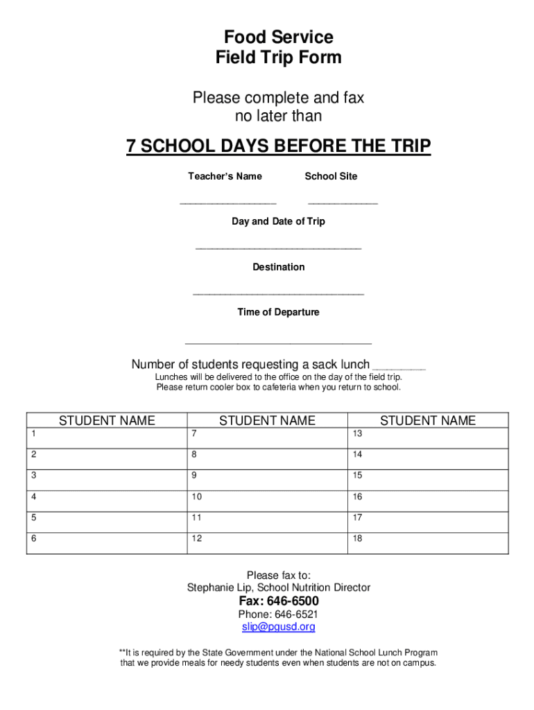 Food Service Field Trip Form Please complete and fax no later than7 SCHOOL DAYS BEFORE THE TRIP Teachers Name ___School Site ___Day and Date of Trip ___ Destination ___ Time of Departure___Number