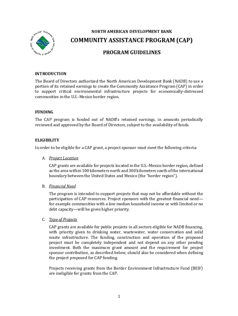 NORTH AMERICAN DEVELOPMENT BANKCOMMUNITY ASSISTANCE PROGRAM (CAP) PROGRAM GUIDELINESINTRODUCTION The Board of Directors authorized the North American Development Bank (NAD) to use a portion of its