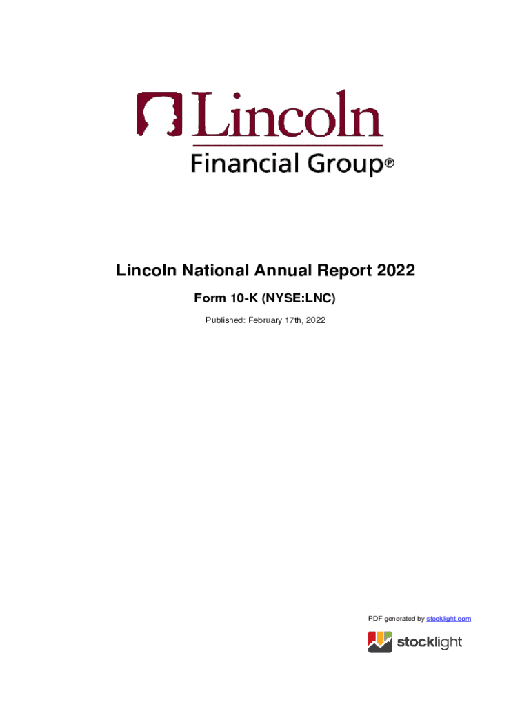Lincoln National Annual Report 2022 Form 10K (NYSE:UNC) Published: February 17th, 2022PDF generated by stock light. Counted STATES SECURITIES AND EXCHANGE COMMISSION WASHINGTON, D. C. 20549 ___FORM