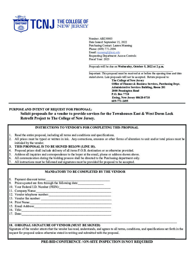Number: AB230003 Date Issued: September 15, 2022, Purchasing Contact: Lauren Manning Phone: (609) 7712894 Email: manningl@tcnj.edu Requesting Department: Access Controls Fiscal Year: 2023___Proposals