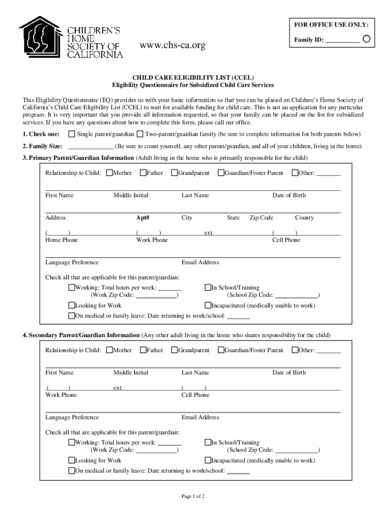 FOR OFFICE USE ONLY: Family ID: ___www.chsca.org CHILD CARE ELIGIBILITY LIST (CCE) Eligibility Questionnaire for Subsidized Child Care ServicesThis Eligibility Questionnaire (EQ) provides us with