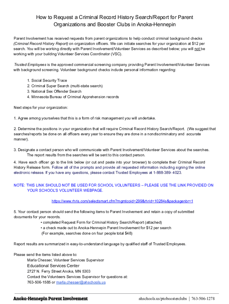 How to Request a Criminal Record History Search/Report for Parent Organizations and Booster Clubs in AnokaHennepin Parent Involvement has received requests from parent organizations to help conduct