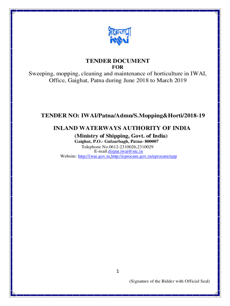 TENDER DOCUMENT Forswearing, mopping, cleaning and maintenance of horticulture in IAI, Office, Haifa, Patna during June 2018 to March 2019TENDER NO: IAI/Patna/Aden/S. Mopping&Horti/201819 INLAND WATERWAYS