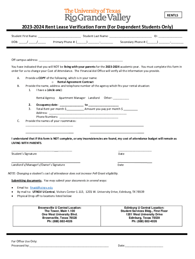 RENTLS20232024 Rent Lease Verification Form (For Dependent Students Only) Student First Name: ___ Student Last Name: ___ ID: ___ DOB: ___/ ___/___Primary Phone #: (___) ______Secondary Phone #: (___)