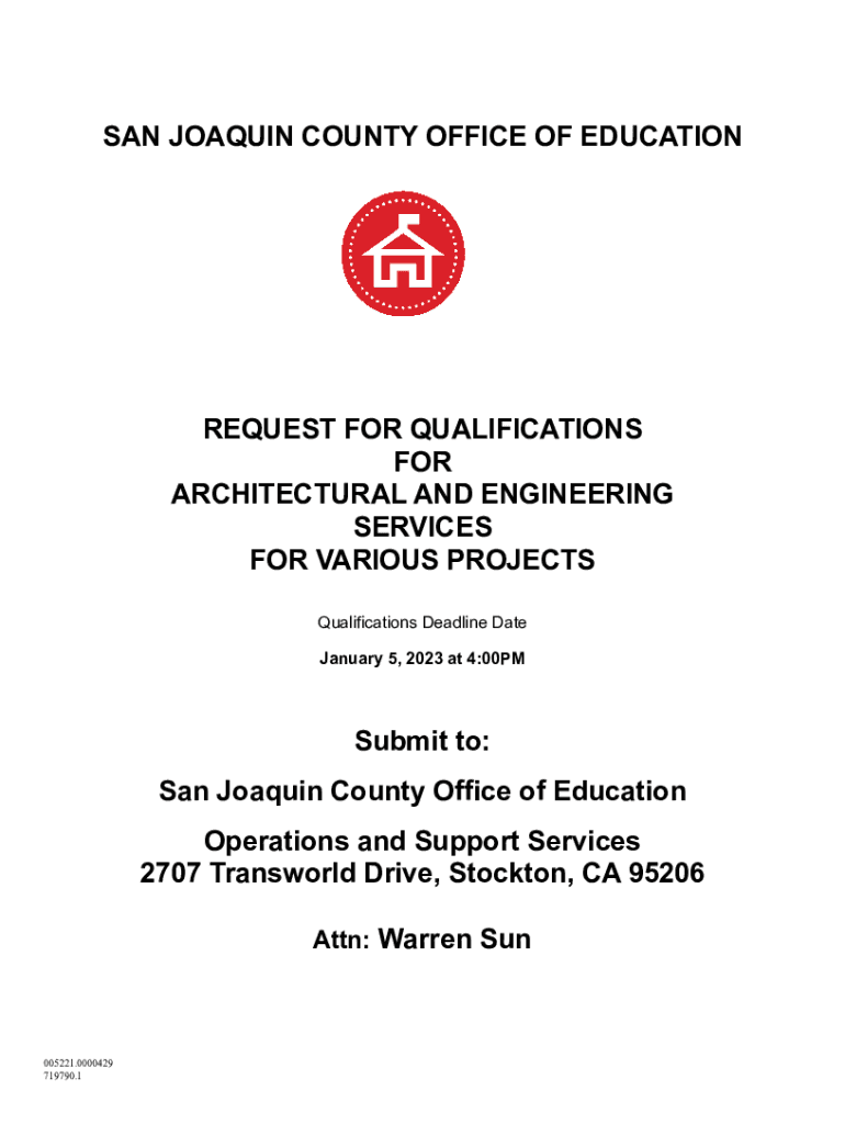 SAN JOAQUIN COUNTY OFFICE OF EDUCATIONREQUEST FOR QUALIFICATIONS FOR ARCHITECTURAL AND ENGINEERING SERVICES FOR VARIOUS PROJECTS Qualifications Deadline Date January 5, 2023, at 4:00PMSubmit to: San