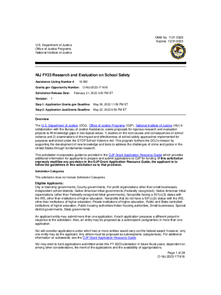 OMB No.11210329 Expires 12/31/2023 U.S. Department of Justice Office of Justice Programs National Institute of Justice FY23 Research and Evaluation on School Safety Assistance Listing Number #16.560Grants.gov