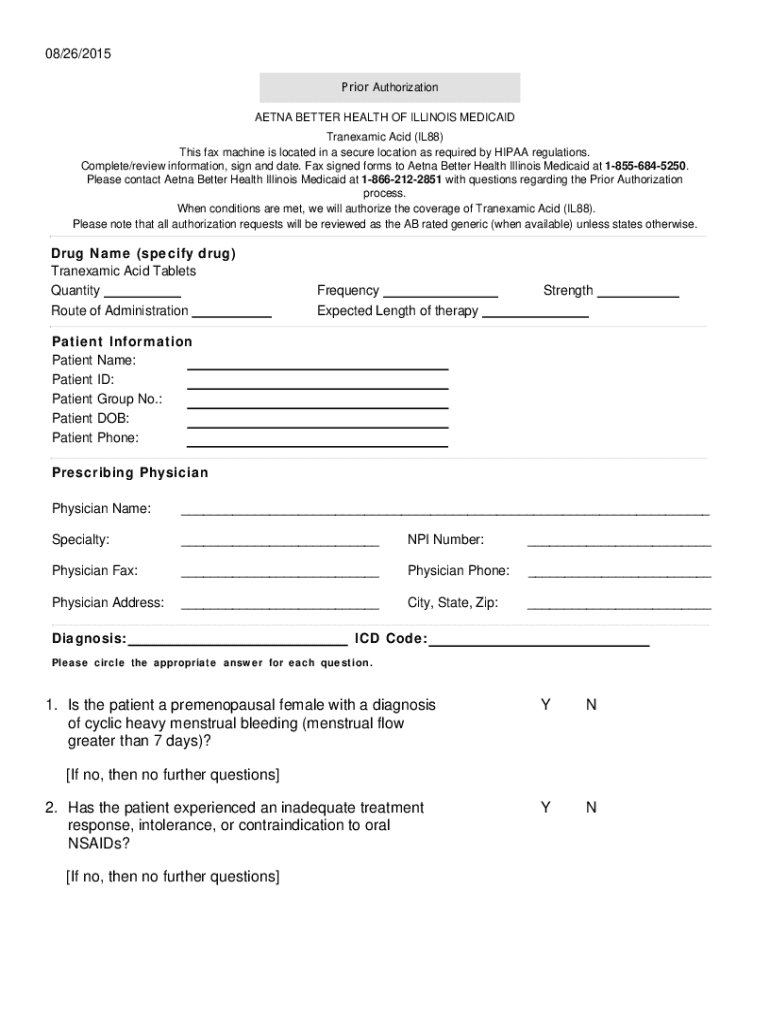 08/26/2015Prior Authorization AETNA BETTER HEALTH OF ILLINOIS MEDICAID Tranexamic Acid (IL88) This fax machine is located in a secure location as required by HIPAA regulations. Complete/review information,