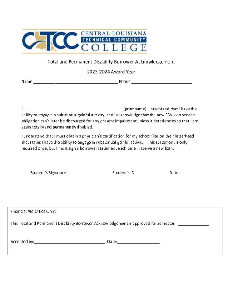 Total and Permanent Disability Borrower Acknowledgement 20232024 Award Year Name:___ Phone:___I, ___ (print name), understand that I have the ability to engage in substantial gainful activity, and