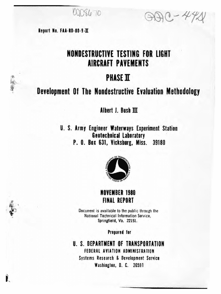 Report No. FAARD809 :U:NONDESTRUCTIVE TESTING FOR LIGHT AIRCRAFT PAVEMENTS PHASE 1I. Development Of The Nondestructive Evaluation Methodology Albert J. Bush m U. S. Any Engineer Waterways Experiment