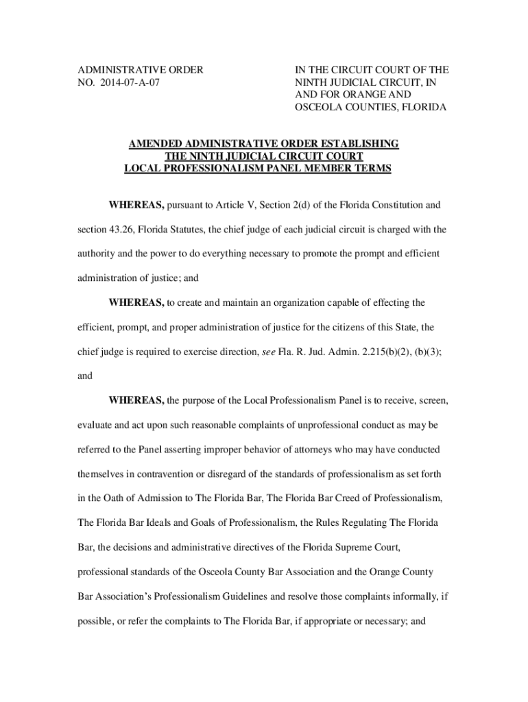 ADMINISTRATIVE ORDER NO. 201407A07IN THE CIRCUIT COURT OF THE NINTH JUDICIAL CIRCUIT, IN AND FOR ORANGE AND OSCEOLA COUNTIES, FLORIDAAMENDED ADMINISTRATIVE ORDER ESTABLISHING THE NINTH JUDICIAL CIRCUIT