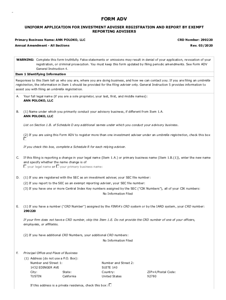FORM ADV UNIFORM APPLICATION FOR INVESTMENT ADVISER REGISTRATION AND REPORT BY EXEMPT REPORTING ADVISERS Primary Business Name: ANN POLO KO, LLC CRD Number: 290220Annual Amendment All Sections Rev.