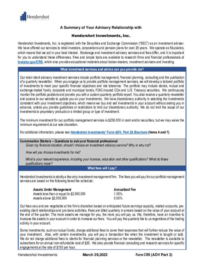 Get the free Hendershot Investments March 29,2022 Form CRS (ADV ...