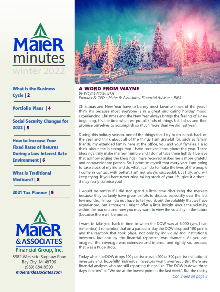 Minutes winter 2022 What is the Business Cycle | 2 Portfolio Plans | 4 Social Security Changes for 2022 | 5 How to Increase Your Fixed Rates of Returns During a Low Interest Rate Environment | 6 What