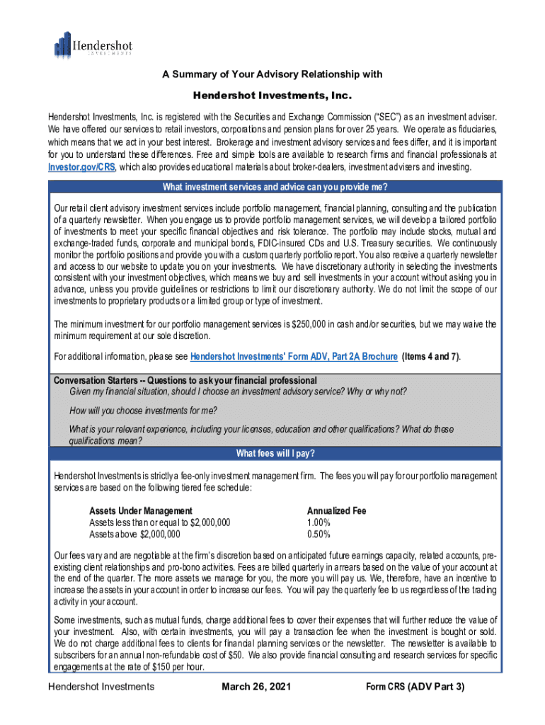 A Summary of Your Advisory Relationship with Henderson Investments, Inc. Henderson Investments, Inc. is registered with the Securities and Exchange Commission (SEC) as an investment adviser. We have