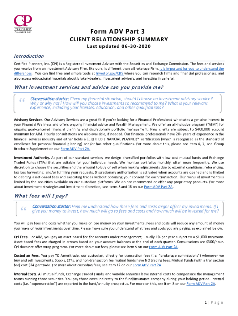 Form ADV Part 3 CLIENT RELATIONSHIP SUMMARY Last updated 06302020 I n t r o d u ct i o n Certified Planners, Inc. (CPI) is a Registered Investment Adviser with the Securities and Exchange Commission.