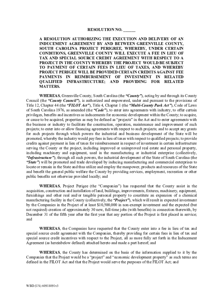 RESOLUTION NO. ___ A RESOLUTION AUTHORIZING THE EXECUTION AND DELIVERY OF AN INDUCEMENT AGREEMENT BY AND BETWEEN GREENVILLE COUNTY, SOUTH CAROLINA PROJECT PEDIGREE, WHEREBY, UNDER CERTAIN CONDITIONS,