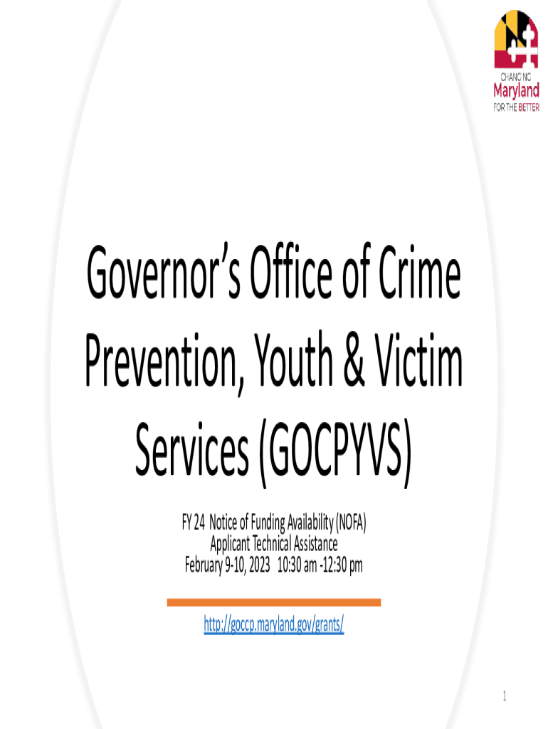 Governors Office of Crime Prevention, Youth & Victim Services (GOSPELS) FY 24 Notice of Funding Availability (NOVA) Applicant Technical Assistance February 910, 2023 10:30 am 12:30 pm http://goccp.maryland.gov/grants/