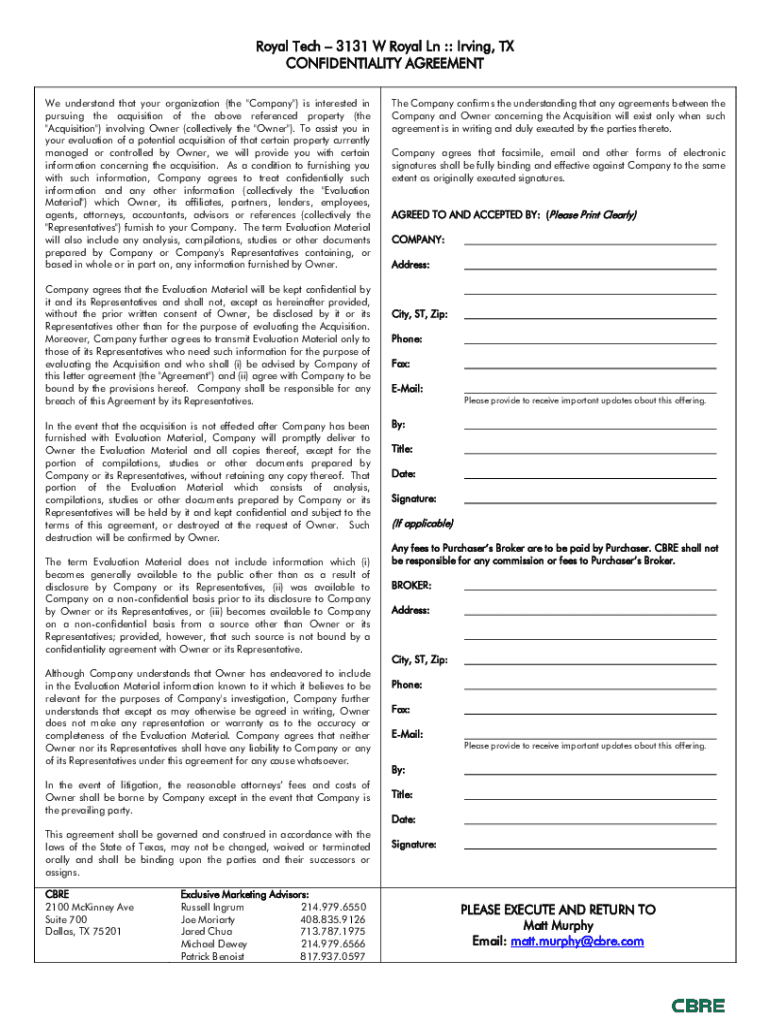 Royal Tech 3131 W Royal Ln :: Irving, TX CONFIDENTIALITY AGREEMENT We understand that your organization (the \” Company\”) is interested in pursuing the acquisition of the above referenced property