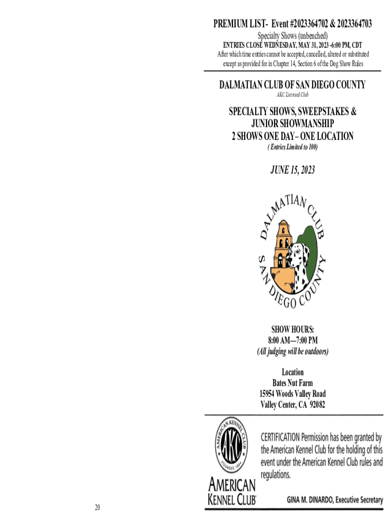 PREMIUM LIST Event #2023364702 & 2023364703 Specialty Shows (benched)ENTRIES CLOSE WEDNESDAY, MAY 31, 2023 6:00 PM, CDT After which time entries cannot be accepted, cancelled, altered or substituted