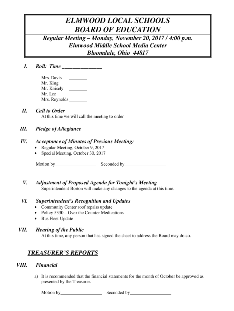ELMWOOD LOCAL SCHOOLS BOARD OF EDUCATION Regular Meeting Monday, November 20, 2017 / 4:00 p.m. Elmwood Middle School Media Center Bloom dale, Ohio 44817 I. Roll: Time ___ Mrs. Davis ___ Mr. King ___