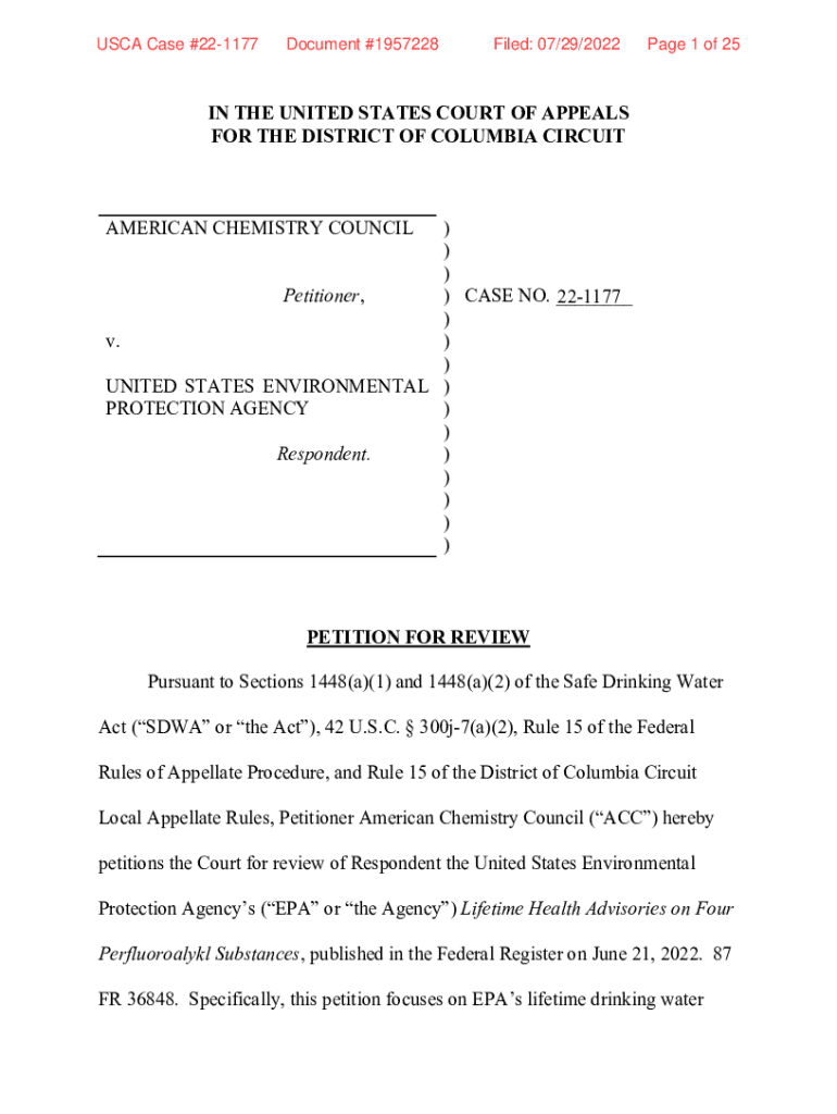USA Case #221177Document #1957228Filed: 07/29/2022Page 1 of 25IN THE UNITED STATES COURT OF APPEALS FOR THE DISTRICT OF COLUMBIA CIRCUITAMERICAN CHEMISTRY COUNCIL))) Petitioner, ) CASE NO. ___ 221177)