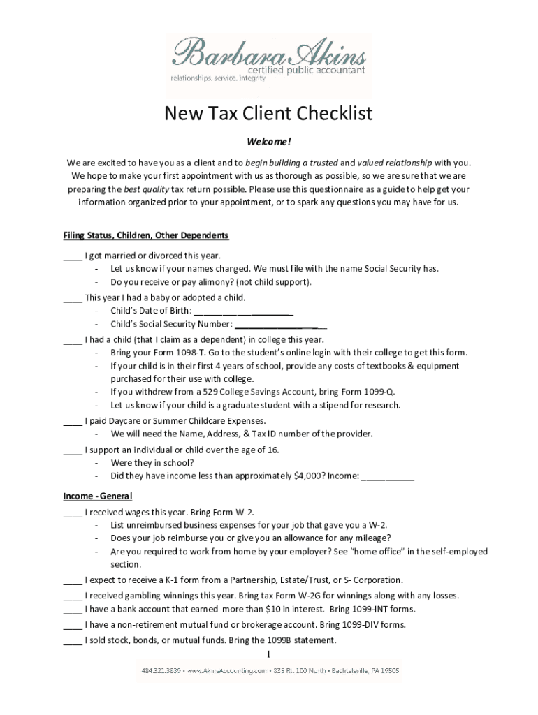 New Tax Client Checklist Welcome! We are excited to have you as a client and to begin building a trusted and valued relationship with you. We hope to make your first appointment with us as thorough