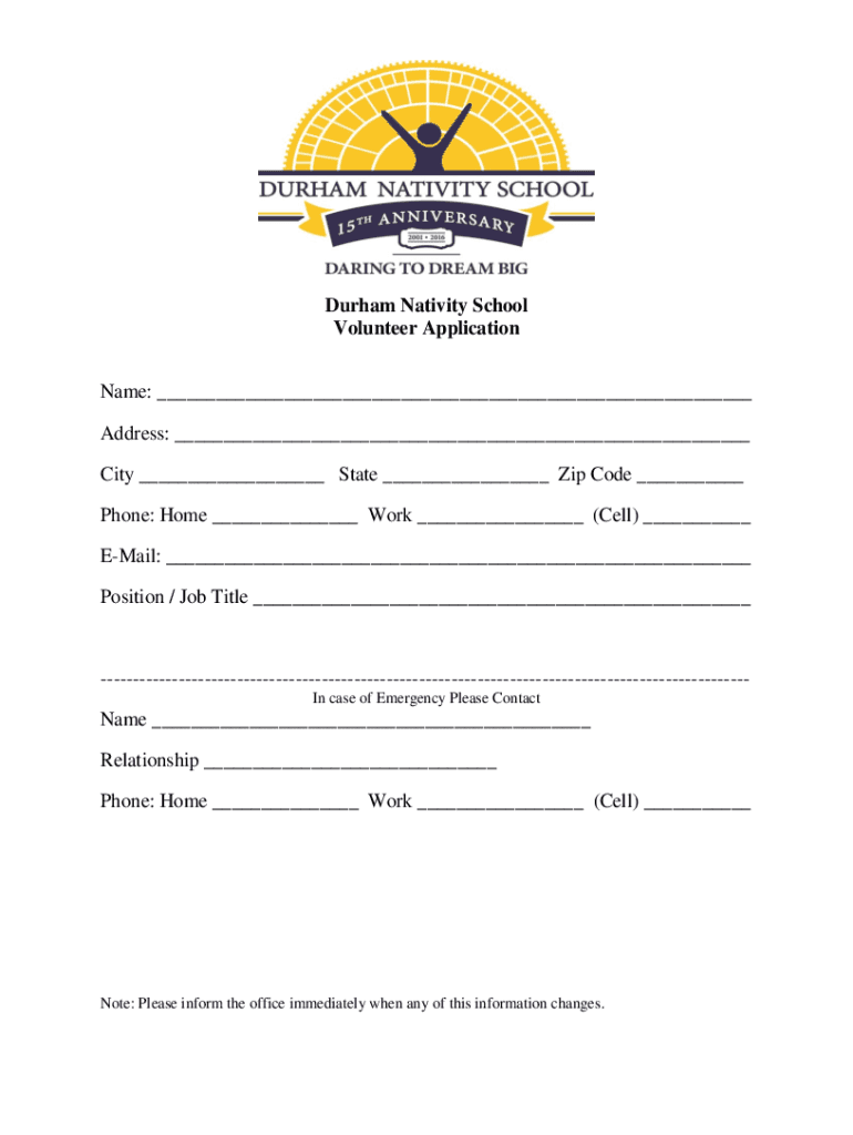 Durham Nativity School Volunteer Application Name: ___ Address: ___ City ___ State ___ Zip Code ___ Phone: Home ___ Work ___ (Cell) ___ Email: ___ Position / Job Title ___In case of Emergency Please