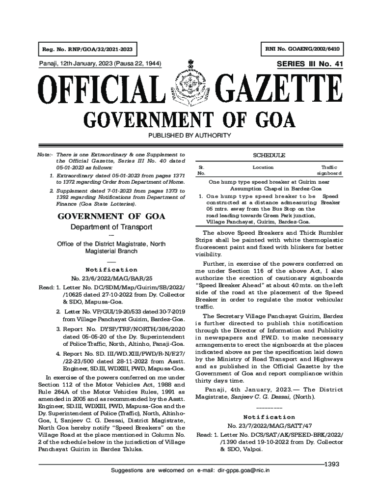 RNA No. GOING/2002/6410Reg. No. RNA/GOA/32/20212023Panaji, 12th January 2023 (Paula 22, 1944)SERIES III No. 41PUBLISHED BY AUTHORITY Note: There is one Extraordinary & one Supplement to the Official