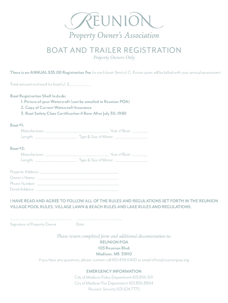 BOAT AND TRAILER REGISTRATION Property Owners Anywhere is an ANNUAL $35.00 Registration Fee for each boat (limit of 2). Future years will be billed with your annual assessment. Total amount enclosed