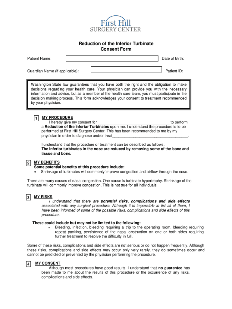 Reduction of the Inferior Turbinate Consent Form Patient Name: Guardian Name (if applicable):Date of Birth: Patient ID:Washington State law guarantees that you have both the right and the obligation