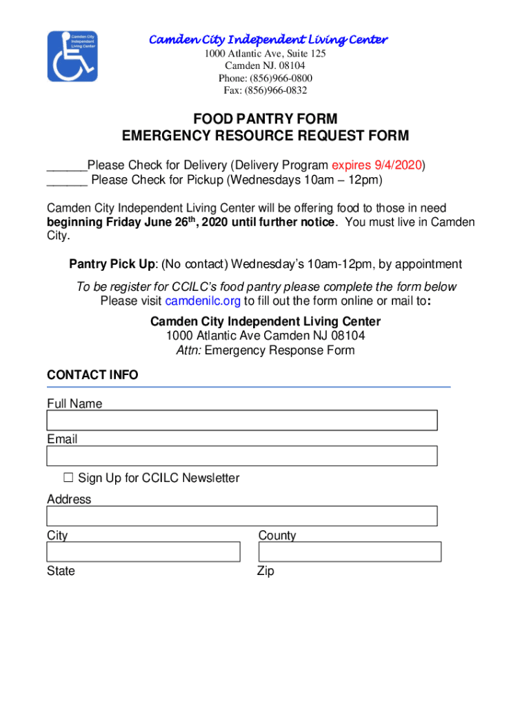 Camden City Independent Living Center 1000 Atlantic Ave, Suite 125 Camden NJ. 08104 Phone: (856)9660800 Fax: (856)9660832FOOD PANTRY FORM EMERGENCY RESOURCE REQUEST FORM ___Please Check for Delivery