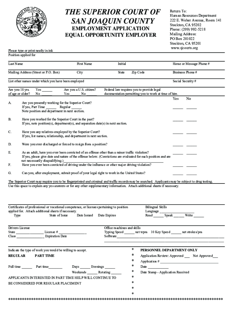 SUPERIOR COURT OF CALIFORNIA COUNTY OF SAN JOAQUIN EMPLOYMENT APPLICATIONABOUT THE COURT The California Constitution provides for a system of courts. The Superior Court serves all the citizens of