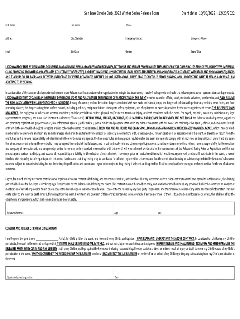 Get the free San Jose Bicycle Club, 2022 Winter Series Release Form