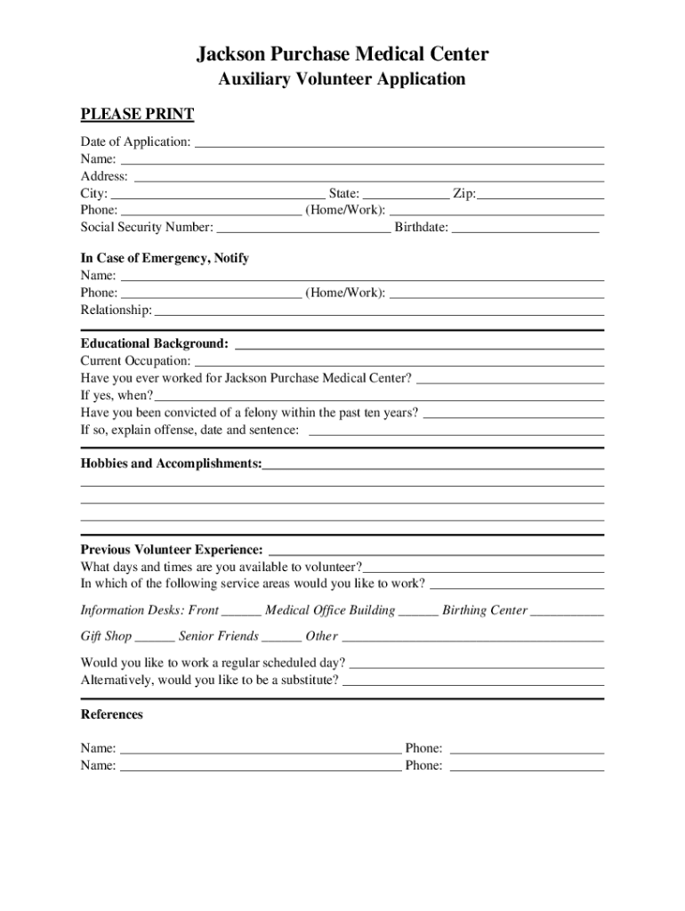 Jackson Purchase Medical Center Auxiliary Volunteer Application PLEASE PRINT Date of Application: ___ Name: ___ Address: ___ City: ___ State: ___ Zip: ___ Phone: ___ (Home/Work): ___ Social Security