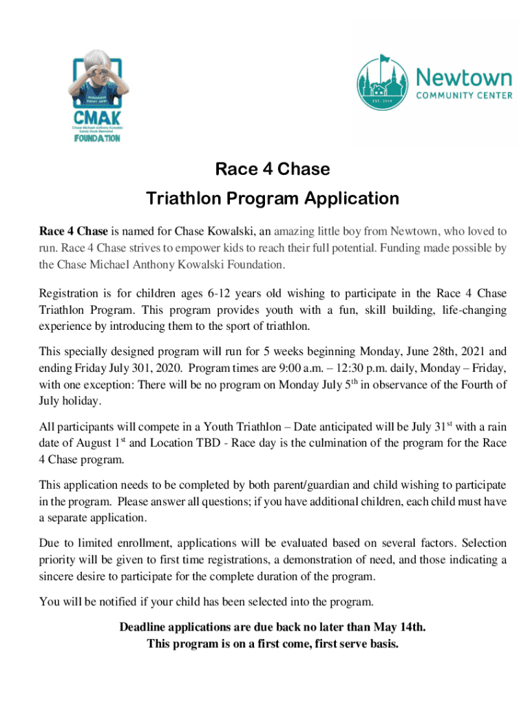 Race 4 Chase Triathlon Program Application Race 4 Chase is named for Chase Kowalski, an amazing little boy from Newton, who loved to run. Race 4 Chase strives to empower kids to reach their full potential.