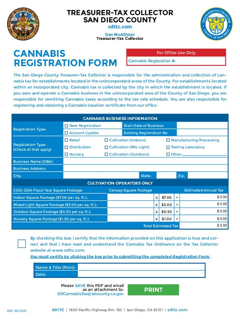 Cannabis Registration #:The San Diego County Treasurer Collector is responsible