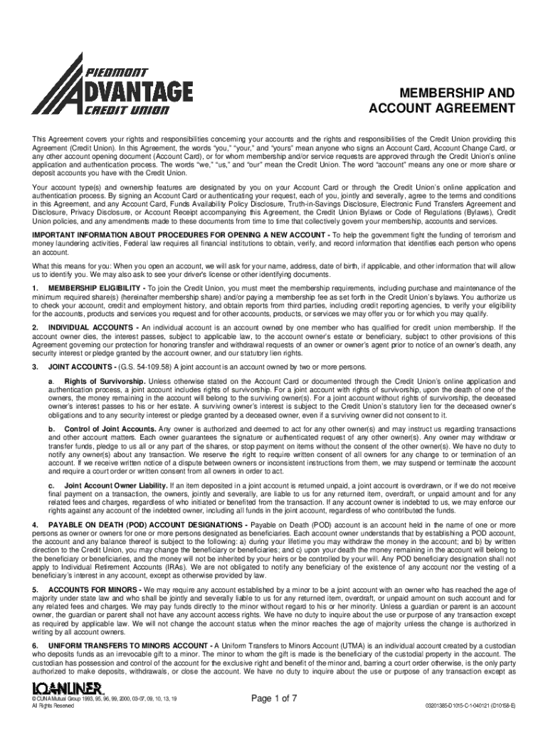 MEMBERSHIP AND ACCOUNT AGREEMENT This Agreement covers your rights and responsibilities concerning your accounts and the rights and responsibilities of the Credit Union providing this Agreement (Credit