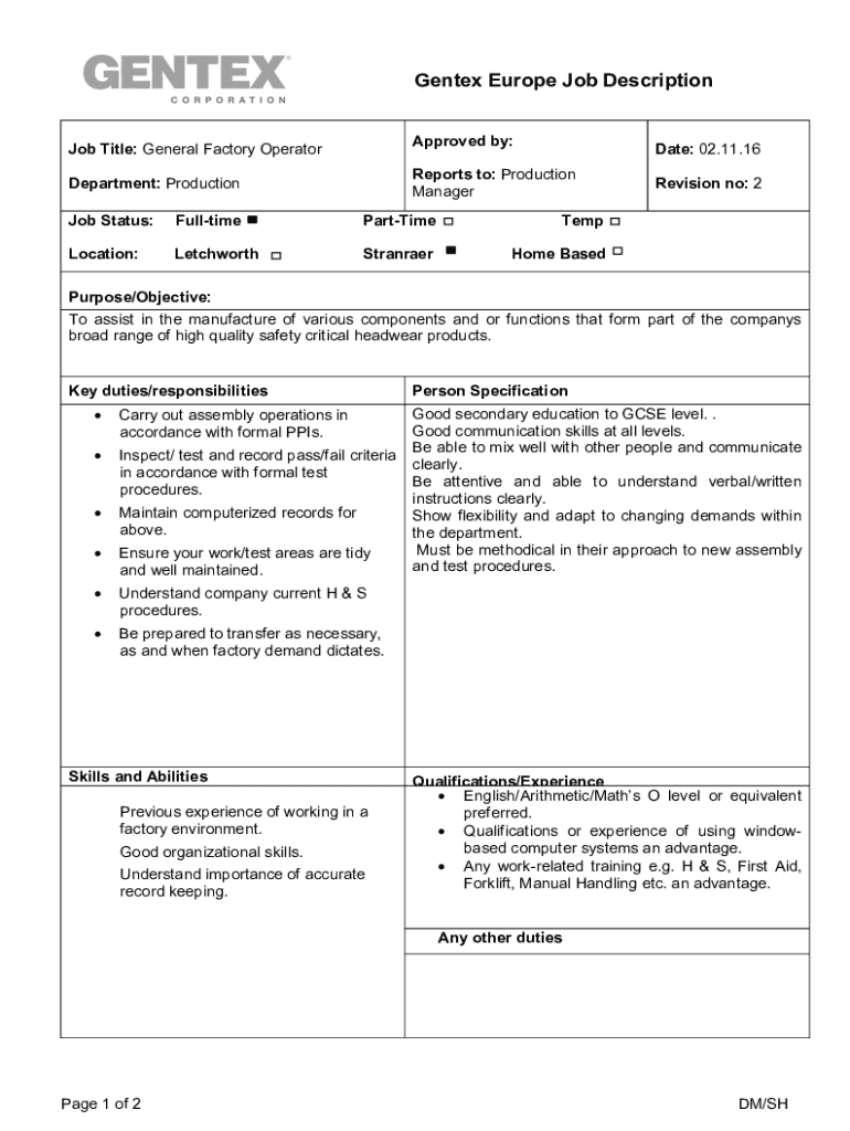 Gent ex Europe Job Description. Approved by:Job Title: General Factory OperatorDate: 02.11.16Reports to: Production