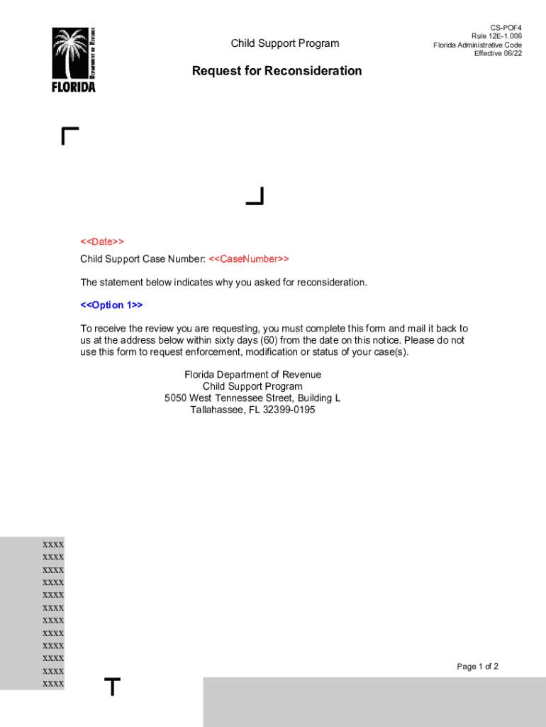 Child Support ProgramCSPOF4 Rule 12E1.006 Florida Administrative Code Effective 06/22Request for ReconsiderationDate Child Support Case Number: Renumber The statement below indicates why you asked