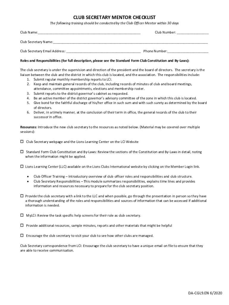 CLUB SECRETARY MENTOR Checklist following training should be conducted by the Club Officer Mentor within 30 days Club Name:___Club Number: ___Club Secretary Name:___ Club Secretary Email Address: