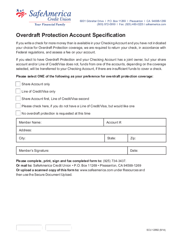 6001 Gibraltar Drive I P.O. Box 11269 I Pleasant on I CA 945881269 (800) 9720999 I Fax: (925) 4600225 I safeamerica. Overdraft Protection Account Specification If you write a check for more money