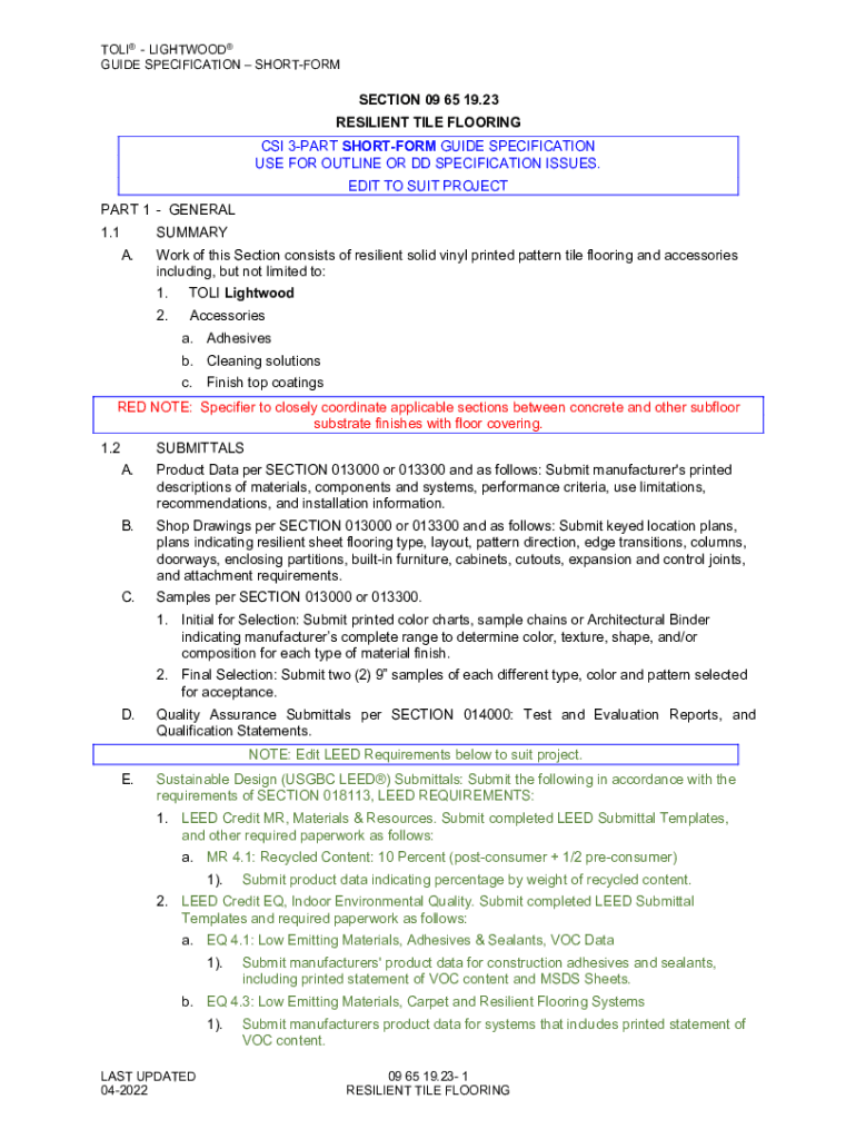 TOLD LIGHTROOM GUIDE SPECIFICATION SHORTFORMSECTION 09 65 19.23 RESILIENT TILE FLOORING CSI 3PART SHORTHORN GUIDE SPECIFICATION USE FOR OUTLINE OR DD SPECIFICATION ISSUES. EDIT TO SUIT PROJECT PART