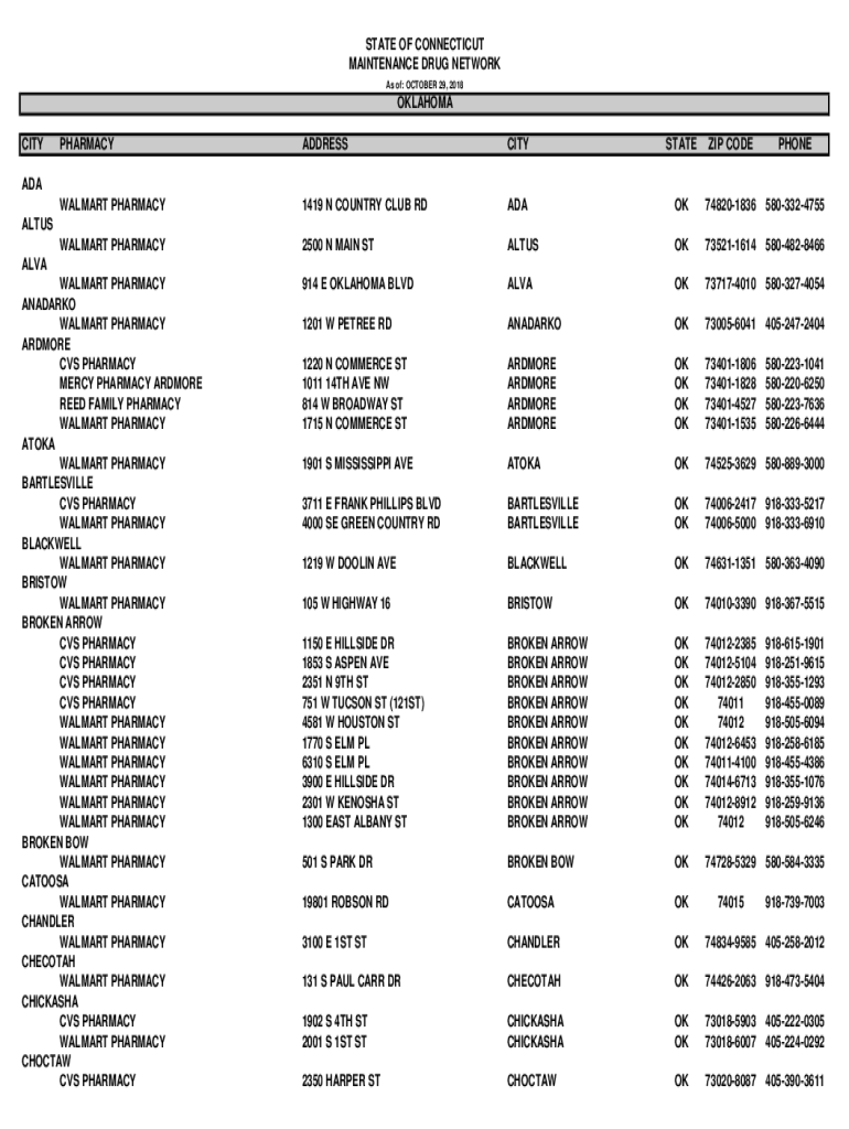 STATE OF CONNECTICUT MAINTENANCE DRUG NETWORK As of: OCTOBER 29, 2018OKLAHOMA CITYPHARMACYADDRESSCITYSTATEZIP CODEPHONEWALMART PHARMACY1419 N COUNTRY CLUB RDADAOK748201836 5803324755WALMART PHARMACY2500