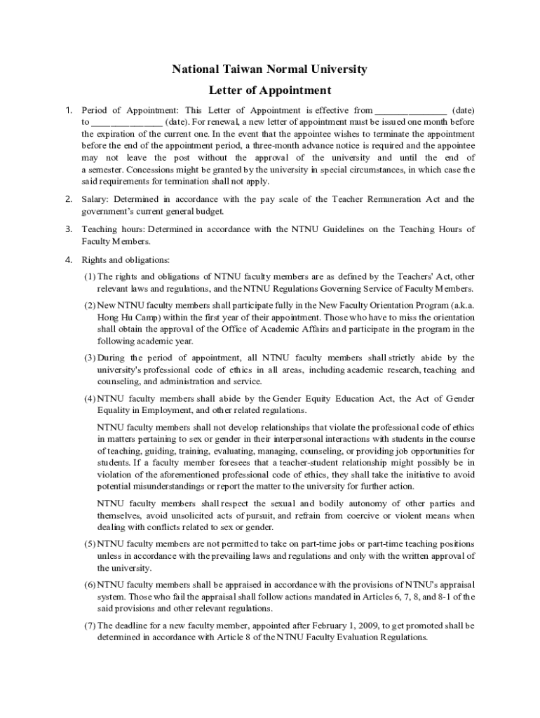 National Taiwan Normal University Letter of Appointment 1. Period of Appointment: This Letter of Appointment is effective from ___ (date) to ___ (date). For renewal, a new letter of appointment must