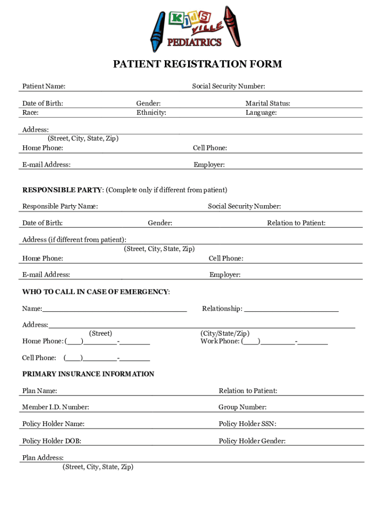 PATIENT REGISTRATION FORM Patient Name:Social Security Number:Date of Birth: Race:Gender: Ethnicity:Marital Status: Language:Address: (Street, City, State, Zip) Home Phone:Cell Phone:Email Address:Employer:RESPONSIBLE